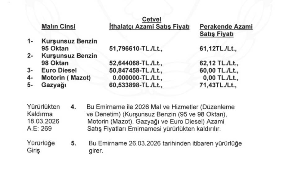 2026 Mal ve Hizmetler (Düzenleme ve Denetim) (Kurşunsuz Benzin (95 ve 98 Oktan), Motorin (Mazot), Gazyağı ve Euro Diesel) Azami Satış Fiyatları Emirnamesi” kapsamında düzenlenen akaryakıt fiyatları yarından itibaren geçerli olacak.