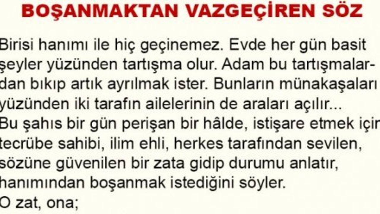 Bu şahıs bir gün perişan bir hâlde, istişare etmek için tecrübe sahibi, ilim ehli, herkes tarafından sevilen, sözüne güvenilen bir zata gidip durumu anlatır, hanımından boşanmak istediğini söyler.