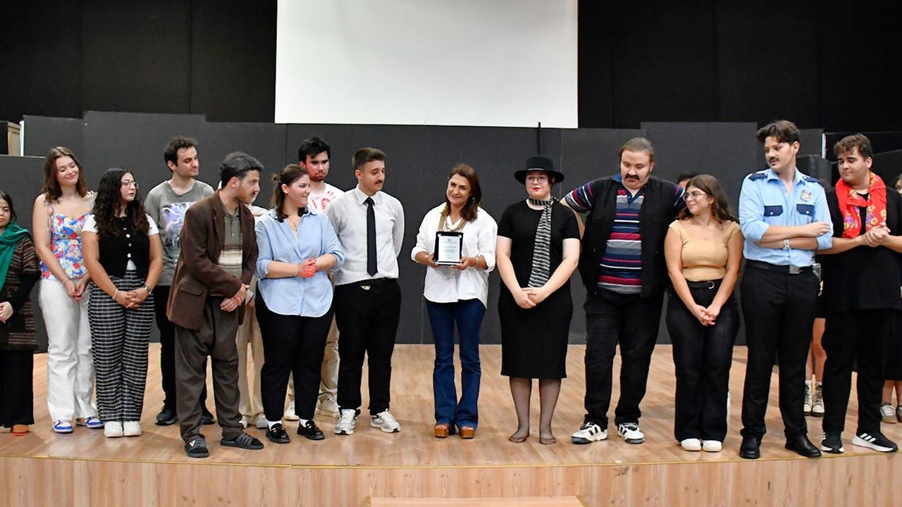 Gösterinin sonunda Öğrenci İşlerinden Sorumlu Rektör Yardımcısı Prof. Dr. Sonuç Zorlu, DAÜ Tiyatro Topluluğu’na anı plaketi ve teşekkür belgesi takdim etti.