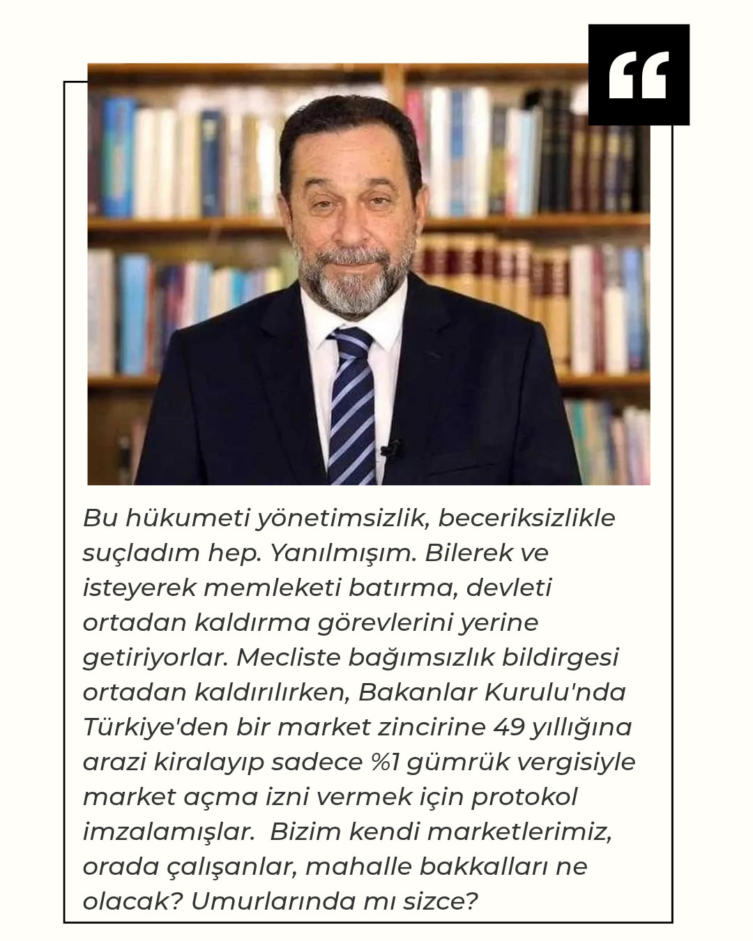 Paylaşımında Meclis’te bağımsızlık bildirgesinin ortadan kaldırılmasına ve Bakanlar Kurulu’nun Türkiye’den bir market zincirine 49 yıllığına arazi kiralayıp sadece yüzde 1 gümrük vergisiyle market açma izni vermesi için protokol imzalamasına değinen Denktaş, “Bizim kendi marketlerimiz, orada çalışanlar, mahalle bakkalları ne olacak? Umurlarında mı sizce?” ifadelerini kullandı.
