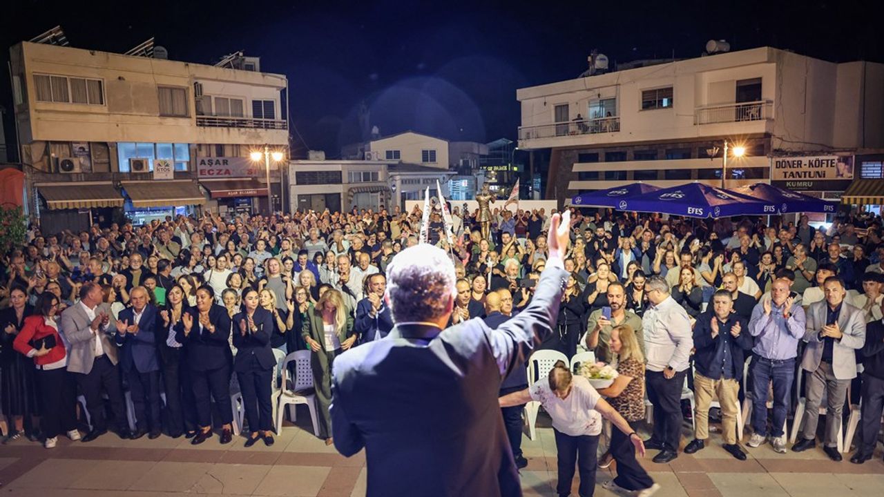 Yağışlı havaya rağmen meydanı dolduran Güzelyurt halkına teşekkür ederek sözlerine başlayan Cumhurbaşkanı adayı Tufan Erhürman, “Güzelyurt, bu akşam adın gibi güzelsin. Adından bile daha güzelsin” dedi.