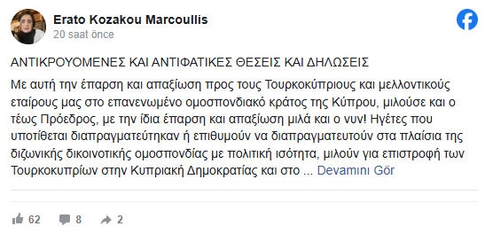 Eski Rum Dışişleri Bakanı Erato Kozaku Markulli, sosyal medya hesabından yaptığı paylaşımda, Rum liderliğinin Kıbrıs sorunu konusundaki söylemlerini eleştirdi.