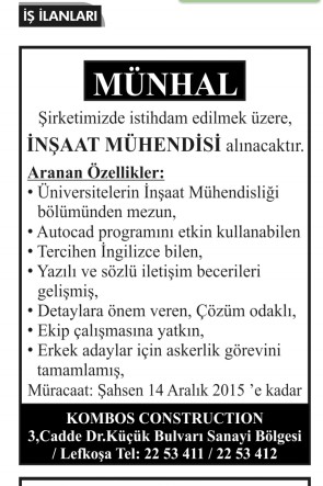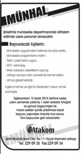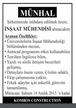 15 ARALIK 2015 SALI PERSONEL ARAYANLAR MÜNHAL İLANLARI