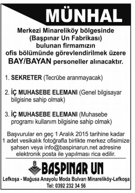 27 KASIM 2015 CUMA PERSONEL ARAYANLAR MÜNHAL İLANLARI