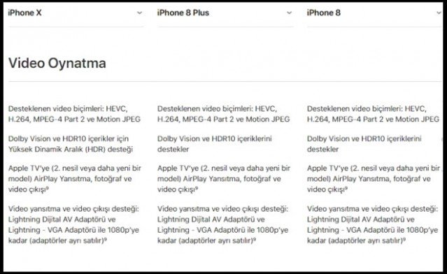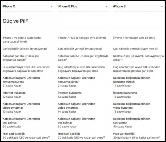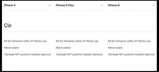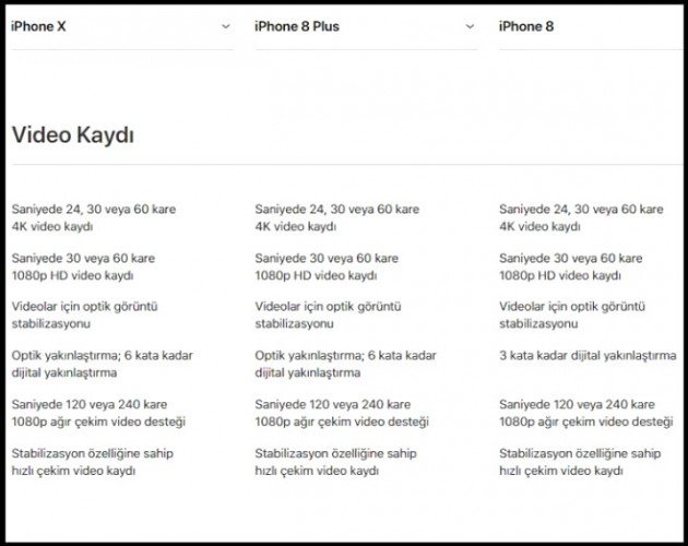 iPhone X, iPhone 8 ve iPhone 8 Plus'ı masada yan yana koyduğumuzda görüntü olarak birbirlerinden farklı üç cihaz görsek te donanımlarına indiğimizde – özellikle Plus modelle – tercihi etkileyecek derecede bir fark olmadığını görüyoruz. Üç cihazın da işlemcisi 6 çekirdekli A11 çip; arka kamerası 4K kalitede 60fps, 1080p kalitede 240fps video çekimi yapmaya izin veriyor ve ön kamera 7 megapiksel ve kablosuz şarjı, kablolu hızlı şarjı destekliyorlar. RAM olarak ta iPhone X ile iPhone 8 Plus, 3GBbelleğe sahipken iPhone 8, 2GB belleğe sahip. Batarya kapasitelerini henüz bilmiyoruz. Üç cihazın da bağlantı noktası Lightning. Lightning demişken kutu içeriğini henüz bilmiyoruz. İlerleyen günlerde Apple'ın sürpriz yapıp yapmadığını hep birlikte göreceğiz.