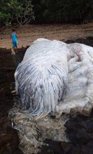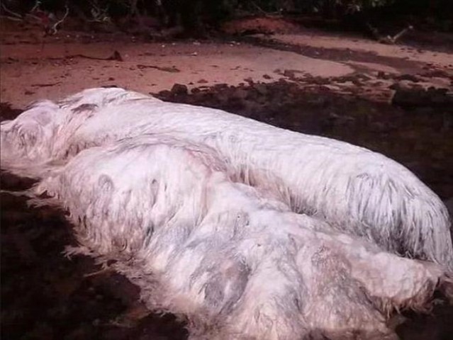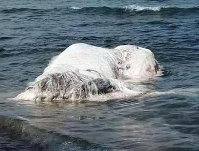 Beyaz tüylü dev yaratığın son depremden sonra karaya vurduğu düşünülüyor.