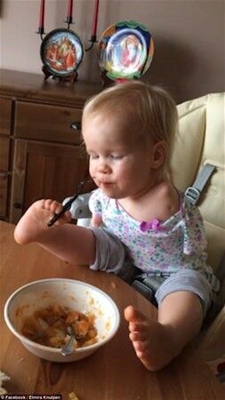 Kolları olmayan minik kız ayağıyla yemek bile yiyebiliyor.