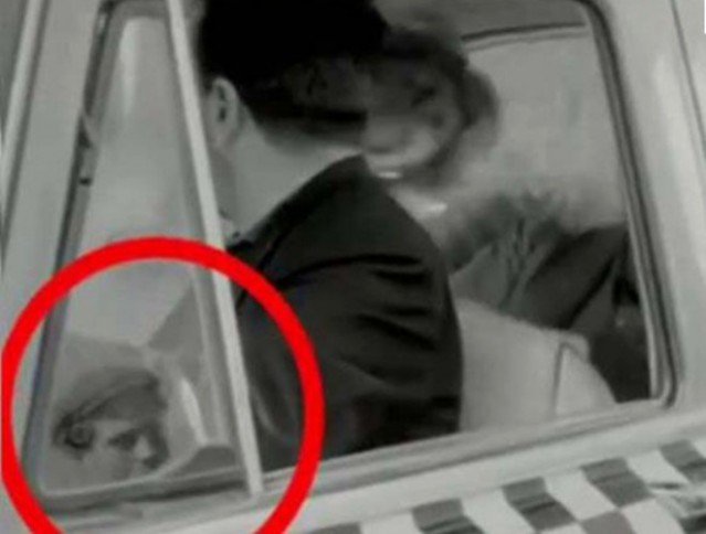 Başrolünde Ayhan Işık'ın yer aldığı 'Şahane Züğürtler' filminin bir sahnesinde, arabadan yansıyan görüntüde çekimi izleyen bir kişi görülüyor.