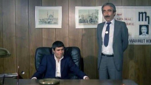 Ancak sonraki sahnede makamında otururken duvardaki ilanda hala Mahmut Holding yazdığı dikkat çekmektedir.