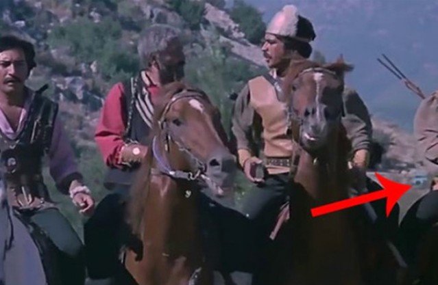 'Malkoçoğlu' filminde atlıların arka planında mavi bir otomobil görünüyor.