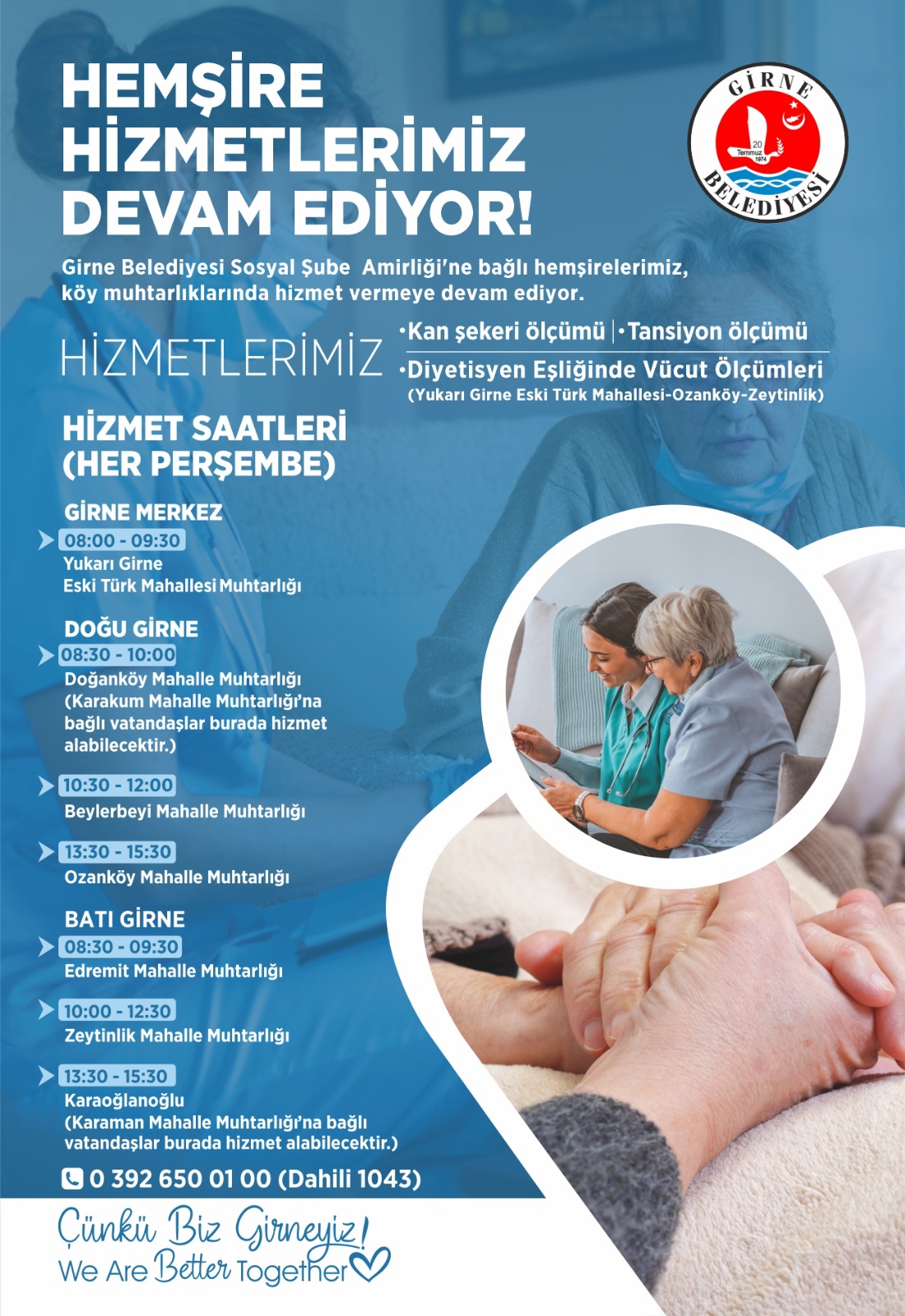 Girne Belediyesi Sosyal Şube Amirliği’ne bağlı hemşireler, her Perşembe günü Girne bölgesi köy muhtarlıklarında vatandaşlara sağlık hizmeti vermeye devam ediyor.