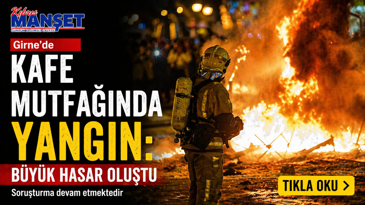 28.04.2026 tarihinde, saat 09.00 sıralarında, Girne’de Ziya Rızkı Caddesi üzerinde faaliyet gösteren bir kafenin mutfağında, muhtemelen elektrik aksamlarının kısa devre yapıp alevlenmesi sonucu yangın meydana gelmiştir. Yangın İtfaiye Ekipleri tarafından söndürülmüş olup çıkan yangın sonucu, işletmenin mutfağı tamamen yanarak zarar görmüştür. Soruşturma devam etmektedir.