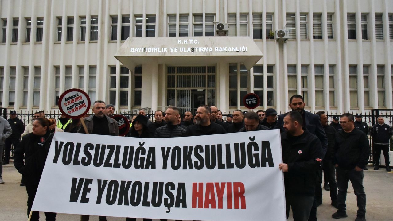 Taşkınköy Şefler Pastanesi önünde toplanan Kıbrıs Türk Amme Memurları Sendikası (KTAMS), Kıbrıs Türk Kamu Görevlileri Sendikası (KAMUSEN), Kamu İşçileri Sendikası (KAMU-İŞ), Kıbrıs Türk Öğretmenler Sendikası (KTÖS) ve Kıbrıs Türk Orta Eğitim Öğretmenler Sendikası (KTOEÖS) yetkilileri, Bayındırlık ve Ulaştırma Bakanlığı önüne yürüdü.