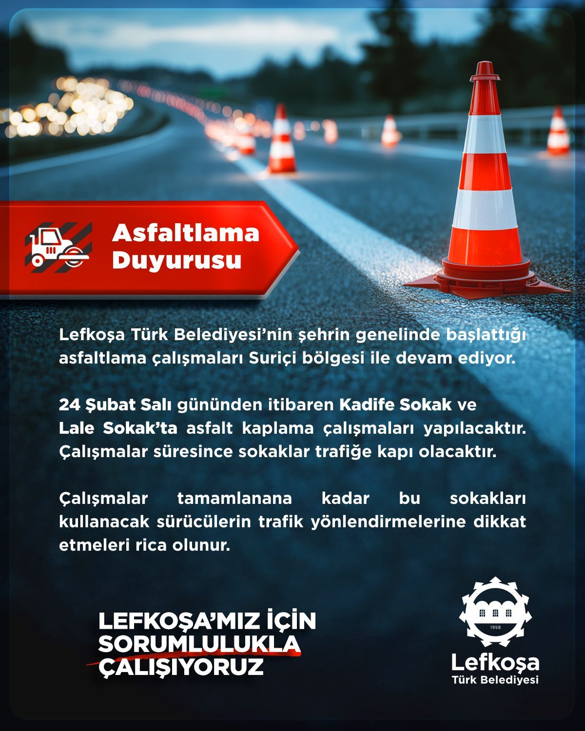 LTB’den yapılan açıklamaya göre, yarından itibaren Kadife Sokak ve Lale Sokak’ta asfalt kaplama çalışmaları yapılacak ve çalışmalar süresince sokaklar trafiğe kapı olacak.