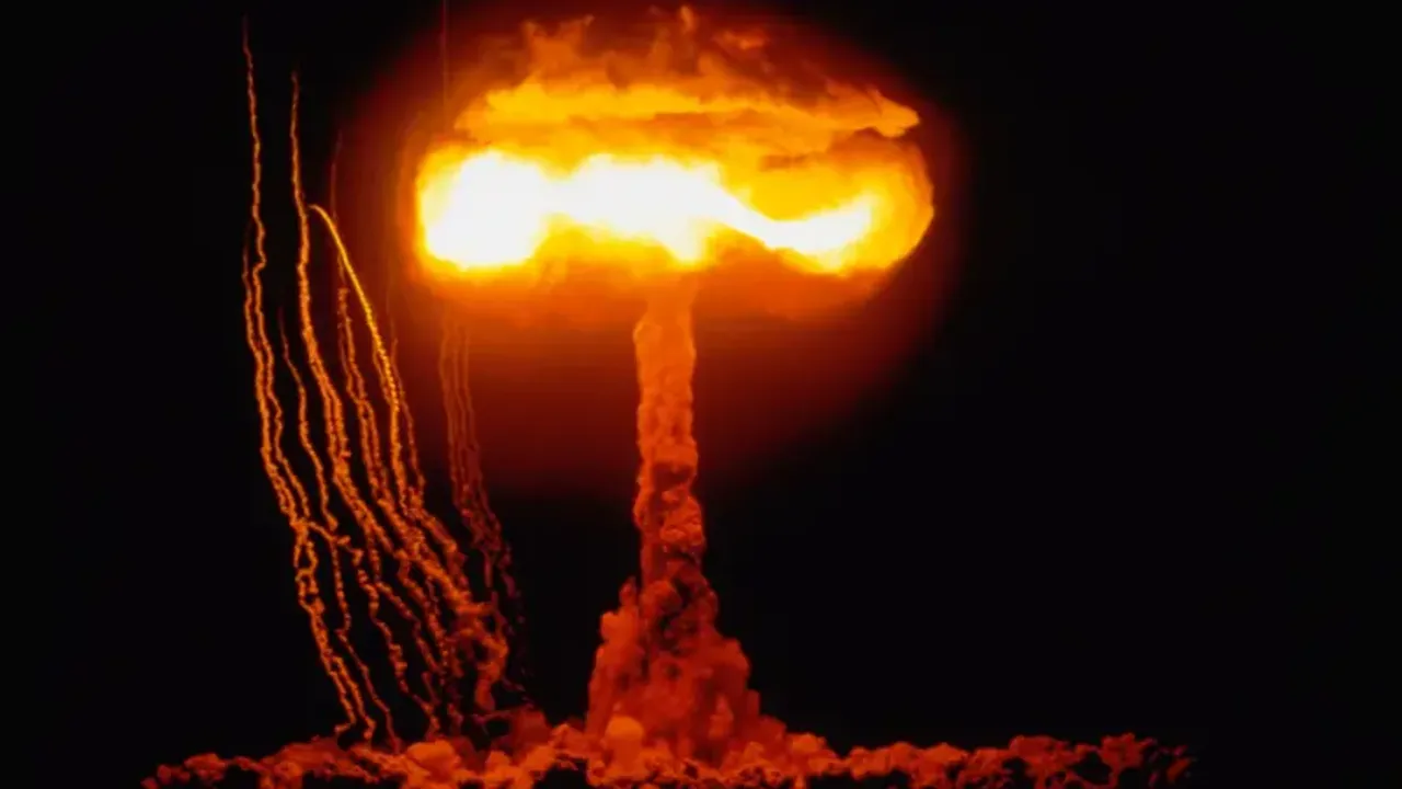 Fotoğraf altı yazısı,16 Temmuz 1945'te New Mexico, Los Alamos'ta gerçekleştirilen Trinity nükleer denemesi. Dünyanın ilk nükleer bombasının patlatılmasından 15 saniye sonrası.