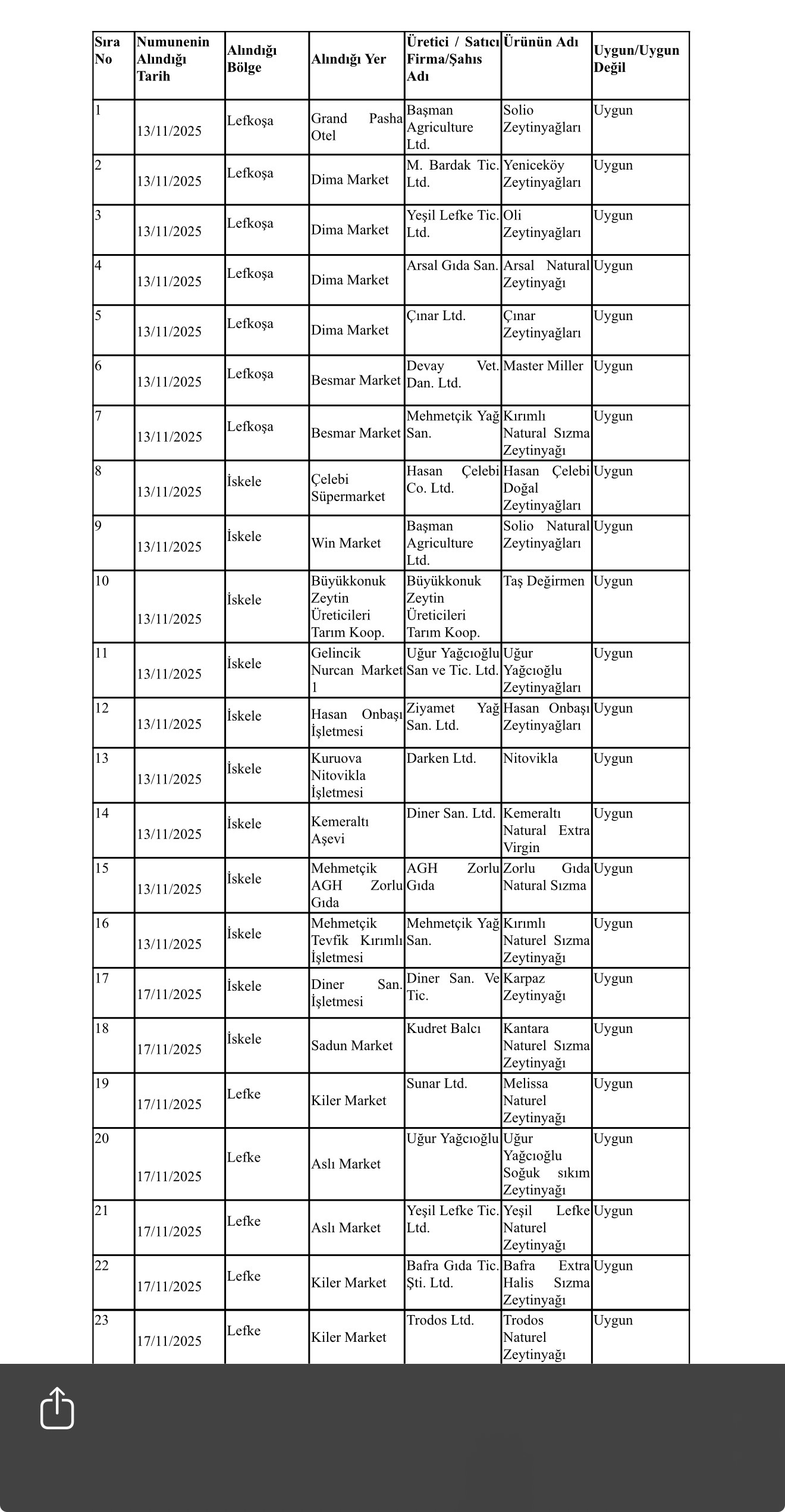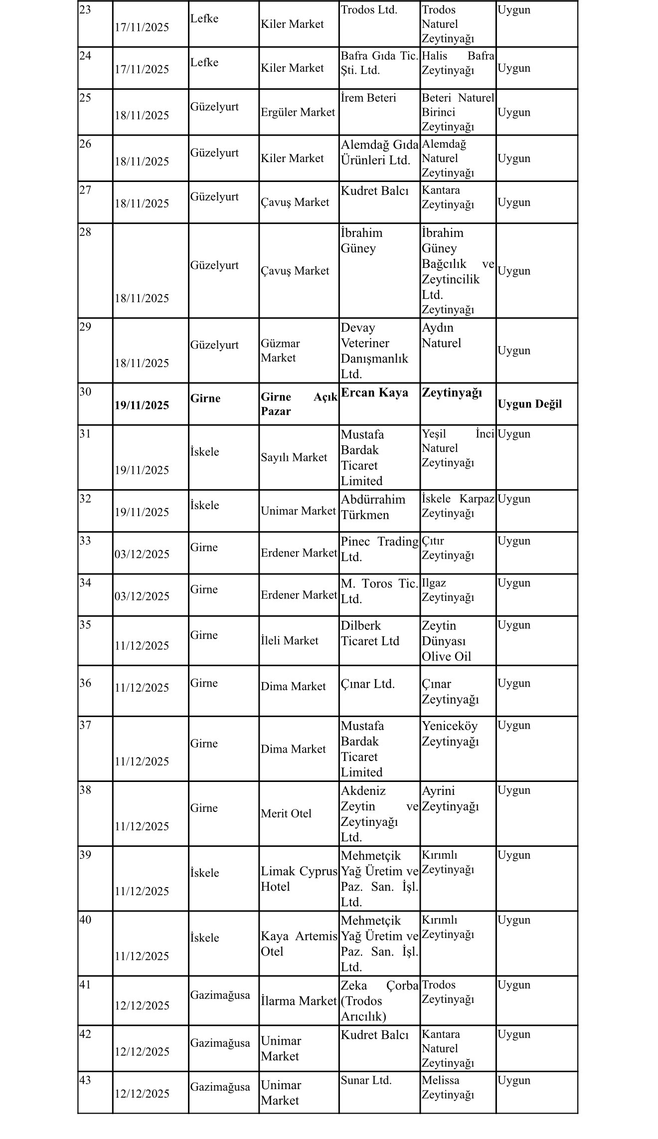 Daireden yapılan açıklamaya göre, 13 Kasım-12 Aralık 2025 döneminde kayıtlılık, etiket ve hijyen kurallarına bakılıp, tağşiş analizi için alınan 43 zeytinyağı numunesinin 42’si uygun bulunurken, 1'inin de tağşişli olduğu saptandı. Tağşişli ürün sattığı tespit edilen üretici hakkında yasal işlem başlatıldı.