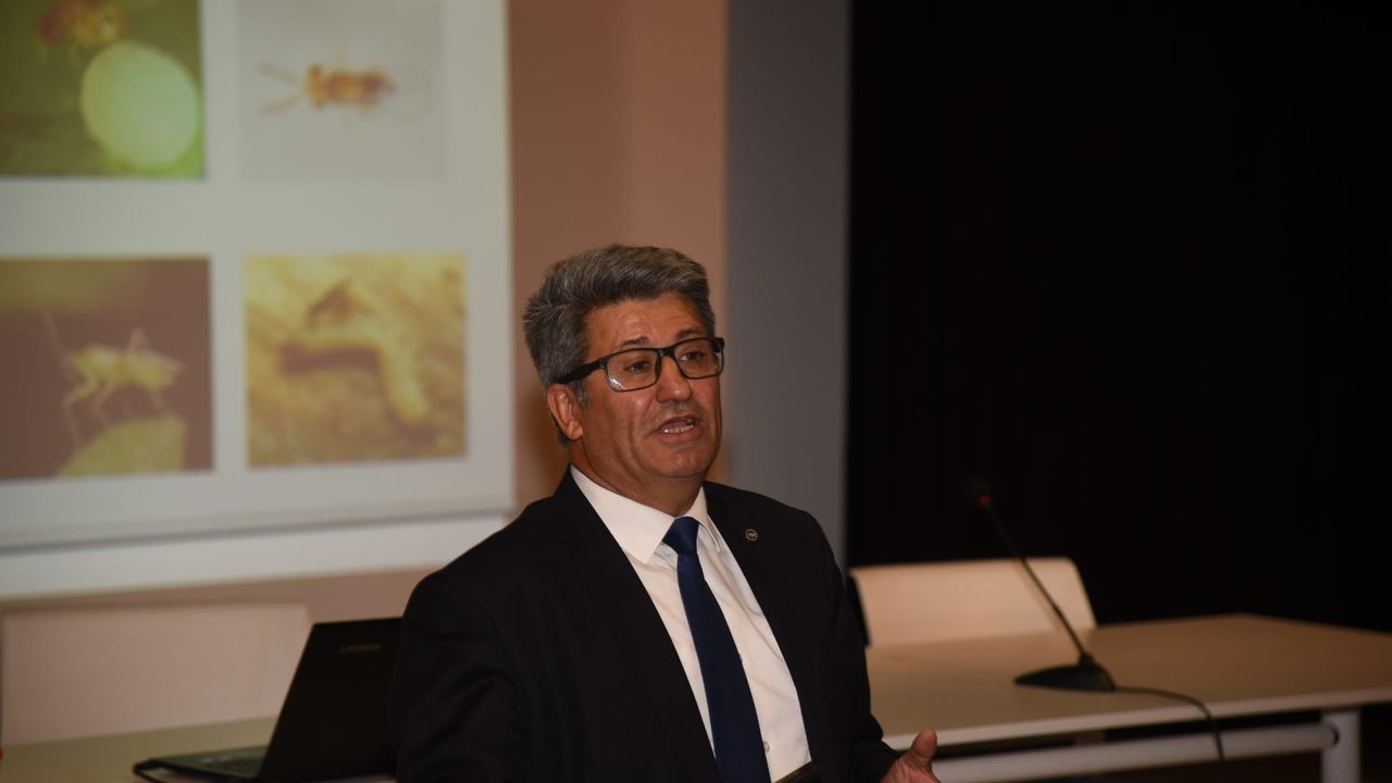 Prof. Dr. Cem Özkan, KTÖS konferans salonunda “Gıda Güvenliği İçin Akıllı Böcekler İş Başında” (Domates Üretiminde Tuta Absoluta Zararlısına Karşı Biyolojik Mücadele) konulu seminer verdi.