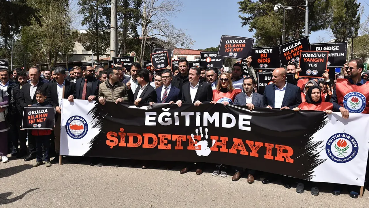 Eğitim-Bir-Sen Genel Başkanı Ali Yalçın ve beraberindeki sendika üyeleri, Şanlıurfa'nın Siverek ilçesinde dün okula silahla giren eski öğrencinin ateş açması sonucu 16 kişinin yaralandığı saldırıya tepki göstermek için Kanlıkuyu Meydanı'nda toplandı.