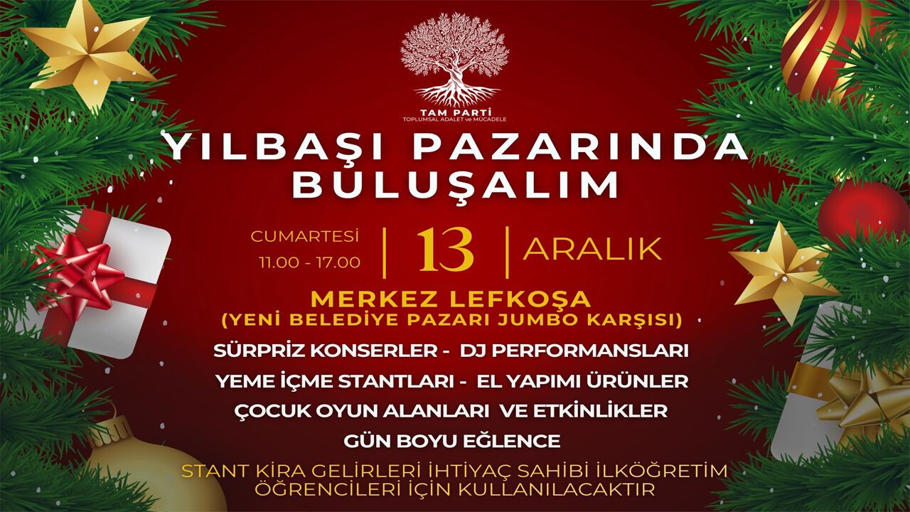 TAM PARTİ Lefkoşa İlçe Koordinatörlüğü'nün girişimleri ve tüm parti birimlerinin desteğiyle hayata geçecek olan projede, yeni yıl ruhu çocukların eğitimine destekle buluşacak. Lefkoşa Türk Belediyesi'nin katkılarıyla düzenlenen TAM PARTİ Yılbaşı Dayanışma Pazarı’nın tüm stant kira gelirleri ihtiyaç sahibi ilköğretim öğrencileri için kullanılacak. Yeme-içme, hediyelik eşyalar, el emeği ürünler gibi pek çok farklı alanda üreticilerin stant açacağı pazarda, sürpriz konserler ve dj performanslarının yanı sıra çocuk oyun alanları da yer alacak.