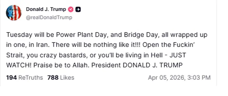 Trump, Hürmüz Boğazı'nın açılması için verdiği 10 günlük sürenin dolmak üzere olmasına gönderme yaparak bir mesaj paylaştı. Üslubu çok sert olan Trump, “Salı günü İran'da hem Enerji Santrali Günü hem de Köprü Günü aynı gün kutlanacak. Bunun gibisi bir daha olmayacak! Lanet olası boğazı açın, sizi deli p…çler! Yoksa cehennemde yaşayacaksınız! İzleyin! Allah'a şükürler olsun!