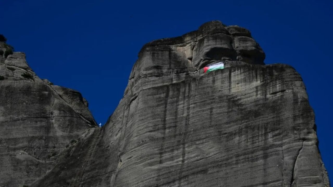 Yunanistan'ın simge doğal oluşumlarından Meteora'ya, Filistin'le dayanışma amacıyla dev Filistin bayrağı asıldı.
